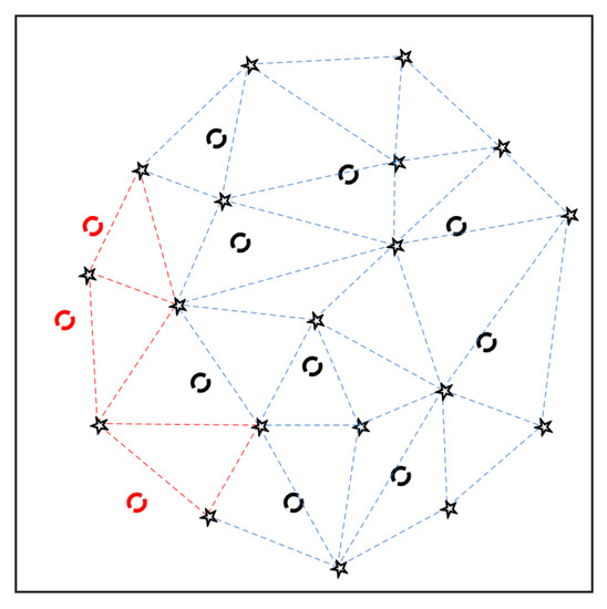The constructed Delaunay triangulation will differ due to the different positions and number of feature points that are extracted for each band. The position of the calculated matching points in Band 1 can be outside the Delaunay triangulation in Band M (e.g., the red dotted circles in Figure 8). In this case, the center of gravity of each triangle was calculated to find the triangle closest to the matching point. This is represented as the red dotted triangle in Figure 8. The affine transformation relationship that is established by the closest triangle is used for resampling pixels. To reduce registration errors which might be caused by mixed pixels, a bilinear resampling operation was performed when applying the affine transformation.