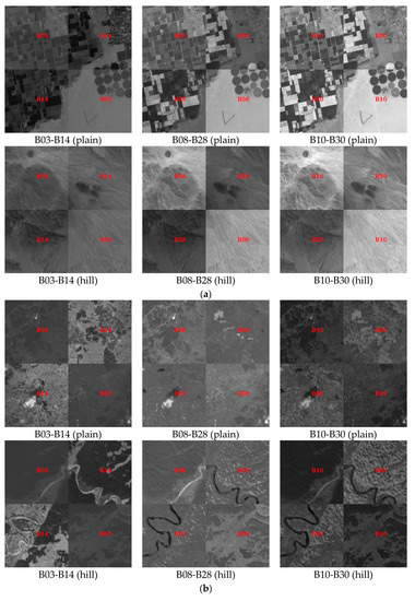 In total, 20 uniformly distributed homonymous points were manually selected for registration accuracy assessment between non-adjacent bands in B03, B14, B08, B28, B10, and B30, respectively. The coordinate deviation between homonymous points was calculated using Equation (16). The registration accuracy between non-adjacent bands was greater than one pixel for the IOEM method. The registration accuracy between non-adjacent bands was located at the sub-pixel level in the proposed method, as shown in Table 3. Lower RMSE values of the proposed method indicate that it can obtain higher registration accuracies than IOEM method.