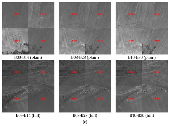 Local comparison of registration results between different bands. (a) OHS–Arizona, USA; (b) OHS–Guangxi, China; (c) OHS–Xinjiang, China.