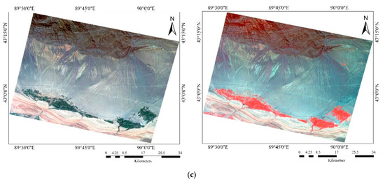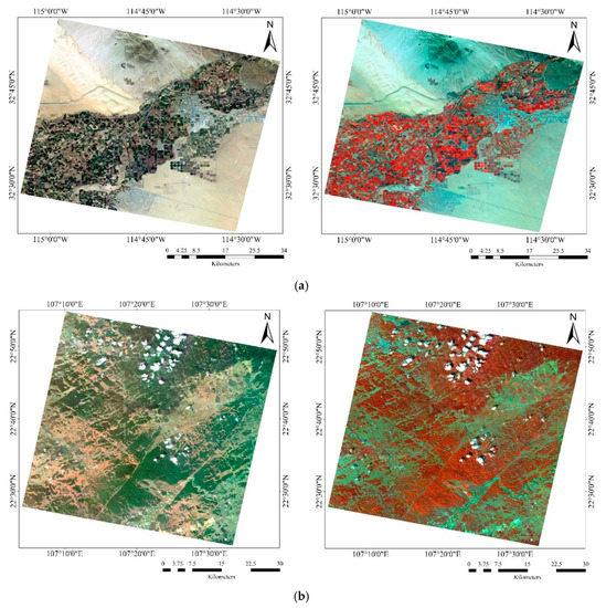True and false-color composite images after registration. Left column: true color (R: B14, G: B08, B: B03), Right column: false-color (R: B28, G: B08, B: B03). (a) OHS–Arizona, USA; (b) OHS–Guangxi, China; (c) OHS–Xinjiang, China.