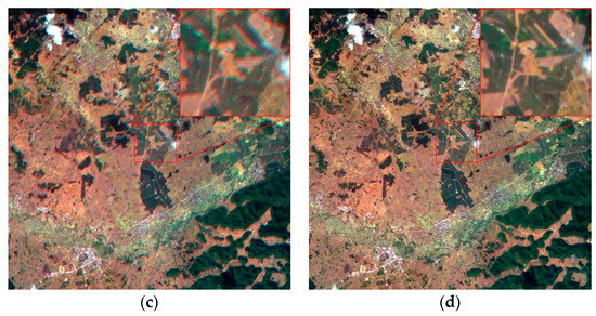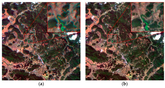 The proposed method was compared with the IOEM method [31]. The IOEM method uses the external and internal parameter error from the hyperspectral camera for on-orbit calibration. Moreover, the IOEM method uses the established internal orientation element model to complete the registration of all spectral bands. Figure 11 illustrates the registration results for the IOEM method and the proposed method for the dataset of OHS-Guangxi, China. The true color composite images produced by the IOEM method exhibited an obvious ghost-shadow phenomenon. Conversely, the true color composite imagery produced by the proposed method clearly showed ground objects with sharper edges and details, and thus featured a better registration accuracy.