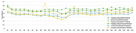The homonymous points were extracted from the adjacent spectral bands after registration. The coordinate displacement between homonymous points was then calculated using Equation (16) to estimate the registration accuracy between adjacent spectral bands. Figure 12 shows the registration accuracy of adjacent bands when using the two methods. The maximum error produced by the IOEM method was 0.65 pixels and the minimum error was 0.30 pixels. However, the maximum error produced by the proposed method was 0.57 pixels and the minimum error was 0.23 pixels. Different accuracies were achieved for the three experimental images. Relatively high errors were revealed in the image covering Xinjiang, China. Since there are large deserts and fewer texture details in the image of Xinjiang, fewer feature points were detected than the other two images. A relatively small number of correctly matched keypoints may lead to a decrease in registration accuracy.
