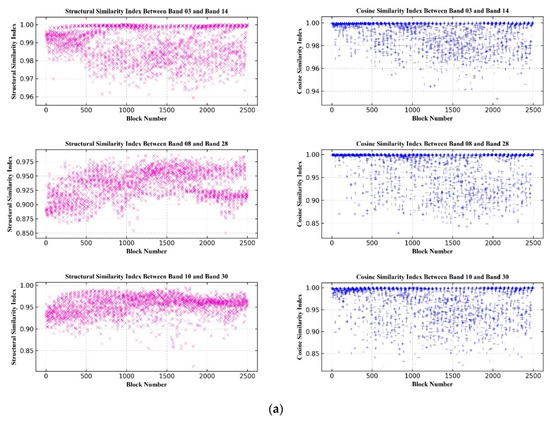 Similarity measures for the registered spectral bands. (a) OHS–Arizona, USA; (b) OHS–Guangxi, China; (c) OHS–Xinjiang, China.