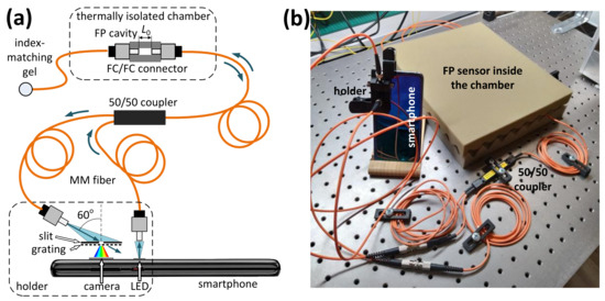 The schematic overview (a) and the photograph (b) of the developed smartphone-based spectrometer and its application for optical fiber Fabry-Perot interferometric sensor interrogation.