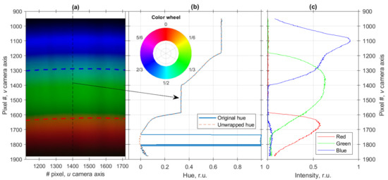 These spectral features can be illustrated more directly by transforming the image shown in Figure 2a from RGB to hue, saturation, value (HSV) format and analyzing the hue channel. A cross-section of spectrum image’s hue distribution along the v axis at is shown in Figure 2b; RGB representation of the same cross-section is shown in Figure 2c. By comparing the plots in Figure 2b,c, it can be clearly seen that the transition areas are due to the overlap between the spectral ranges occupied by red, green and blue channels and is determined by the optical filters used in the camera. The hue values are calculated according to the following equation