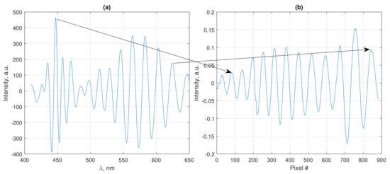 - Finally, knowing the positions of two reference points, corresponding to certain wavelengths for each spectrum column, it was possible to interpolate all the columns and resample them to a true wavelength scale. The interpolation based on the fast Fourier transform [38] was applied. After spectrum columns interpolation, the columns were averaged, resulting in substantial increase of spectrum signal-to-noise ratio. Therefore, regardless of misalignment of the optical components of SPBS, the wavelength scale of the measured spectrum can be restored according to the two reference points.