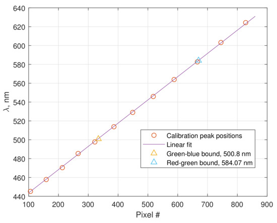 The correspondence between the peaks positions is shown in Figure 4 together with the linear fit. The positions of the red-to-green and green-to-blue transition areas of SPBS spectrum were estimated as described in the previous subsection, their corresponding wavelengths were found using the linear fit of FPI peaks’ coordinates.