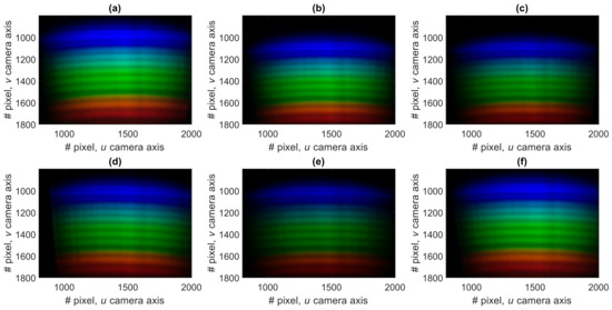 Our hue-based spectral self-calibration approach allows us to overcome this limitation and enables correct wavelength scale reconstruction and accurate signal demodulation in case of reasonably large offsets of the fiber and diffraction grating holders. A series of experimental trials was performed to verify this ability. The interferometric sensing element was stabilized by being put inside a thermally and vibrationally isolated chamber, thus ensuring that its true OPD remained constant, while fluctuation of the measured OPD value can characterize the robustness and accuracy of the proposed spectral self-calibration approach. Prior to each measurement of the interferometer spectrum, the holder was removed from the smartphone and then reattached without any special alignment. The only condition for the calibration and the measurement procedures to be performed is that the light from the LED is coupled to the fiber and interferometer spectrum is visible at some place of the camera image. Six spectra images are shown in Figure 6a–f. Horizontal, vertical and small angular misalignment of spectra can be clearly noticed.
