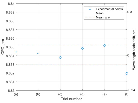 Interferometer optical path differences (OPD) values (left vertical axis) and corresponding spectra wavelength shifts (right vertical axis) demodulated from the spectra shown in Figure 6a–f. Solid line shows the mean OPD and dashed lines show the standard deviations of the experimental data.