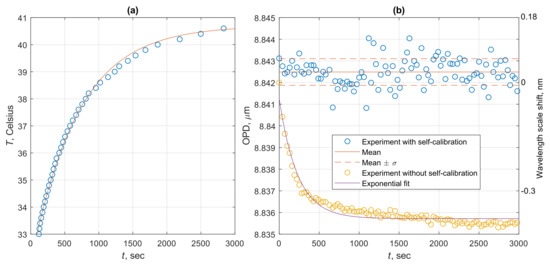 (a) Change of the temperature on the smartphone surface during the optical fiber sensor interrogation. Circles—experimental points, curve—exponential fit. (b) Curves of demodulated interferometer OPD in case of application of the proposed spectral self-calibration and conventional demodulation with only initial wavelength calibration. Right-hand side vertical axis illustrates the corresponding shift of the wavelength scale. Solid line shows the mean OPD and dashed lines show the standard deviation of the experimental data.