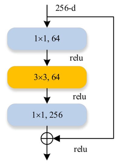 In 2015, He Kaiming, a researcher at Microsoft Research Institute, proposed a residual network with 152 layers and won the championship in the image recognition project of the ImageNet Large Scale Visual Recognition Challenge (ILSVRC). The residual network proposed the bottleneck residual block (BRB) structure, as shown in Figure 2. BRB is composed of 1 × 1 convolution layer, ReLU layer, 3 × 3 convolution layer, ReLU layer, 1 × 1 convolution layer, ReLU layer. The number of feature maps of the three convolutional layers in BRB is 64, 64, 256, respectively. By introducing identify mapping into CNN, the problem of gradient diffusion in deep CNN can be effectively solved, and the parameters are reduced while the depth of CNN is increased, which further improves the performance of CNN.