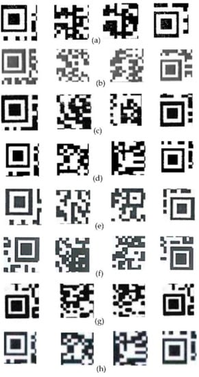 Image samples for QR codes printed by eight printers. (a) Canon iR-ADV C50455051 UFR2, (b) Canon iR-ADV C7260270 UFR2 (Canon Inc., Tokyo, Japan), (c) Epson L310 Series(Seiko Epson Ltd., Suwa, Japan), (d) Fuji XEROX DocuCentre S2110, (e) RICOH Aficio MP7502(Ricoh Ltd., Tokyo, Japan), (f) RICOH Pro8100s, (g) Samsung K2200 series(Samsung Electronics Ltd., Seoul, Korea), and (h) TOSHIBA e-STUDIO2051C-11606695(Toshiba, Tokyo, Japan).