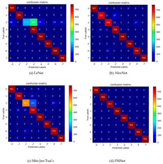 First, a confusion matrix is used to measure the accuracy of classification model, the confusion matrix of LeNet, AlexNet, Min-Jen Tsai, and PSINet is shown in Figure 6, where the columns represent predicted labels and the rows represent true labels, the values on the diagonal indicates the number of correct prediction, and non-diagonal elements are the part of prediction errors. The higher the value on the diagonal of the confusion matrix, the more accurate the prediction result. It can be seen that the value on the diagonal of the confusion matrix of PSINet is the largest, followed by AlexNet, then Min-Jen Tsai’s, and finally LeNet. Among them, PSINet has a high number of correct identification on all eight types of printers, while the number of correct identification of AlexNet on class 1 and class 2 printers in slightly lower than that of PSINet, the performance of Min-Jen Tsai’s on class 2 printer is significantly lower than that of PSINet and AlexNet, only 581 were correctly identified, LeNet’s test on class 2 printer is undoubtedly the worst, only 229 were correctly judged.