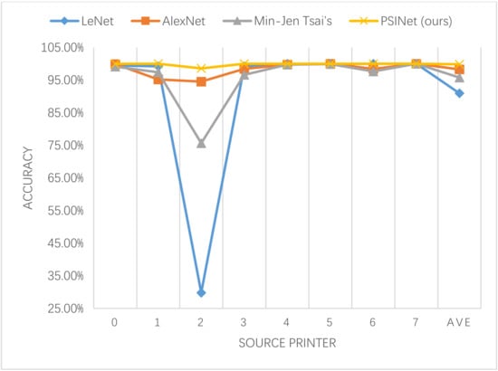 In this section, PSINet is compared with other CNN methods in identification accuracy to verify its effectiveness. It is well known that in the field of printer source identification, the size of input image is relatively small, and it can be seen from Section 3.3 that the shallow convolutional neural network is more suitable for printer source identification. Based on the above considerations, LeNet and AlexNet, which are currently widely used in the field of digital image forensics, are selected for comparison. In addition, there is CNN method specifically proposed for the field of printer source identification, such as Min-Jen Tsai’s [28], which is also used for comparison to verify the effectiveness and superiority of PSINet. It is worth mentioning that Anselmo Ferreira’s [26] and Do-Guk Kim’s [27] are not considered because their data input methods and data collection scenarios are quite different from that of PSINet. The size of the QR code image blocks used in the experiment are 64 × 64, after the blocks are divided according to the above size, there are 18,432 images in the calibration set, 6144 images in the validation set and 6144 images in the prediction set. They are evenly distributed in 8 types of printers, that is, each printer prints the same amount.