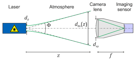 The theoretical model of publication [7] assumes a scenario as depicted in Figure 1. A laser emits a beam with a Gaussian beam profile and illuminates a sensor consisting of a camera lens and an imaging sensor. In Figure 1, the camera lens is represented by a single lens, but is treated as an optical system consisting of several optical elements. In order to describe the irradiance distribution at the focal plane of the camera lens and the response of the imaging sensor to the laser radiation, we used the parameters listed in Table 1.