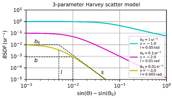 Bidirectional scattering distribution function according to the 3-parameter Harvey scatter model for different sets of scatter parameters.