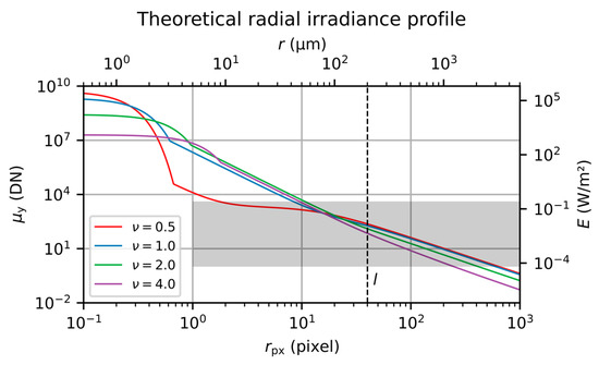 As an example, Figure 3 shows a set of four curves for the camera signal and irradiance as a function of radial coordinate for different values of the truncation factor . The curves were calculated using Equations (1) and (15) with the following set of parameters: