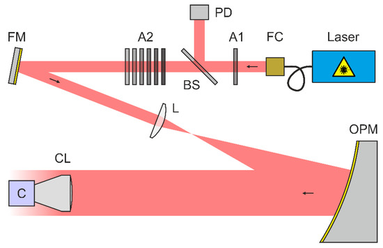 A scheme of our experimental setup to measure the irradiance at the focal plane of a camera lens is shown in Figure 4. As a light source, we used a Toptica iChrome MLE multi-wavelength laser source. This laser source offers four different laser wavelengths of 488 nm, 515 nm, 561 nm and 640 nm, which all were coupled into a common single-mode fiber. Depending on the wavelength, the output power at the fiber exit port ranged from 40 to 100 mW. The laser light was collimated using a reflective fiber collimator FC (Thorlabs RC08APC-P01). Attenuator A1 (neutral density filter Thorlabs NE40B-A) was used to set the maximum laser power to a value in the order of 1 µW. Subsequently, the light path was divided using beam splitter BS (Thorlabs CM1-BP1), sending the reflected part to the reference photodiode PD (Ophir PD300R-UV sensor head with power meter Ophir Vega). The transmitted light passed a second attenuator A2, consisting of a set of neutral density filters (Thorlabs NExxB, where xx relates to the optical density). In the further course, the laser beam passed a folding mirror FM and was expanded by a Keplerian telescope with magnification built by a focusing lens L (Thorlabs LA1484-A, ) and an off-axis parabolic mirror OPM (Optical Surfaces Ltd. 037-0220, ). Finally, the collimated laser beam was sent to the camera lens CL under test. The laser beam diameters at the entrance of the camera lens were 21.5, 21.1, 20.3 and 20.1 mm for the laser wavelengths of 488, 515, 561 and 640 nm, respectively. For details on the laser beam diameter measurements see Appendix B.