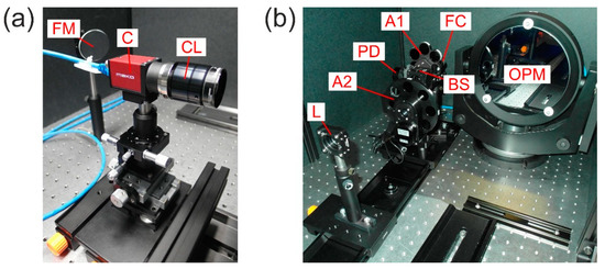 Photographs of different parts of the experimental setup: (a) camera C with camera lens CL and folding mirror FM and (b) fiber collimator FC, attenuators A1 and A2, beam splitter BS, (reference) photodiode PD, focusing lens L and off-axis parabolic mirror OPM.