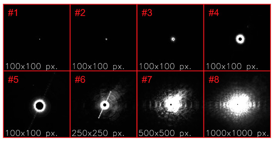 Figure 6 shows some example images for the camera lens Edmund Optics 86410, acquired at the laser wavelength of and for an f-number of . The red labels correspond to the setting number indicated in Table 4. Please note, that the individual images do not show the complete camera image comprising 2048 pixels × 2048 pixels, but only the central section. The individual image sections also differed in size depending on the exposed area; see the white annotations within the images.