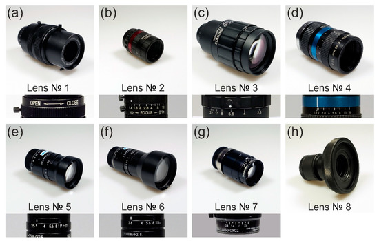 Camera lenses used for the experiments: (a) Edmund Optics 54690, (b) Edmund Optics 67715, (c) Edmund Optics 86410, (d) LINOS MeVis-C 1.8/50, (e) Navitar NMV-75, (f) Navitar NMV-100, (g) Schneider-Kreuznach Xenoplan 2.8/50 and (h) Thorlabs AC254-050-A (achromatic doublet).