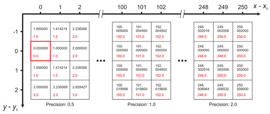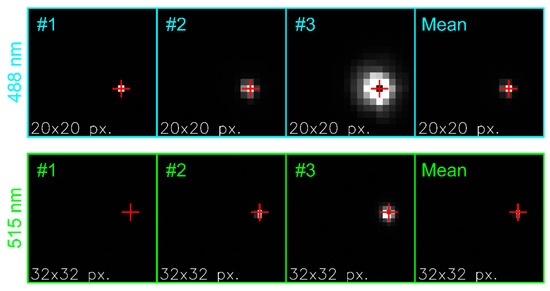 For the camera lens Edmund Optics 86410 () this procedure is depicted in Figure 8 for the two laser wavelengths of 488 nm and 515 nm. In each frame, a red cross marks the estimated center of the laser spot.