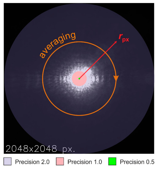 In order to find the lens-generated radial irradiance profile in the focal plane, the pixel values for each occurring radial distance to the center of the laser sport were averaged. The principle of the process is illustrated in Figure 9. It shows a complete image of 2048 pixels × 2048 pixels, as taken with setting no. 8 in Figure 6. A red arrow indicates the radial coordinate axis. The orange arrow depicts the circular averaging process for a specific radial coordinate.