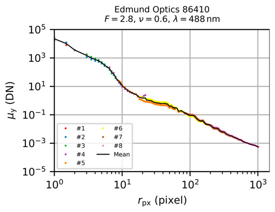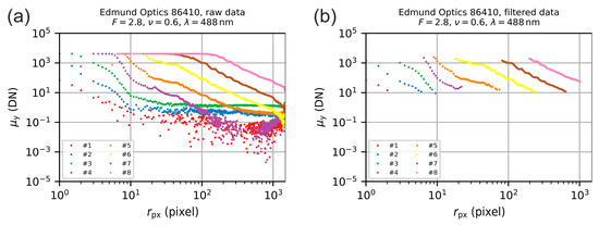Now, we will describe in detail the above-mentioned analysis process. As an example, we used part of the data of the camera lens Edmund Optics 86410. Example images acquired with this camera lens for a laser wavelength of and an f-number are shown in Figure 6. Subsequent to the data analysis process for all camera lenses, we performed a statistical analysis of the scatter parameters. These results are presented in Section 6.
