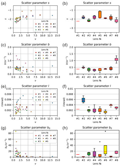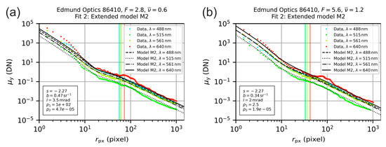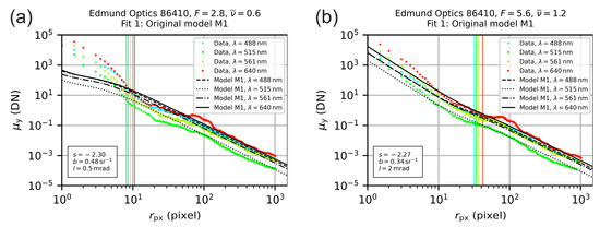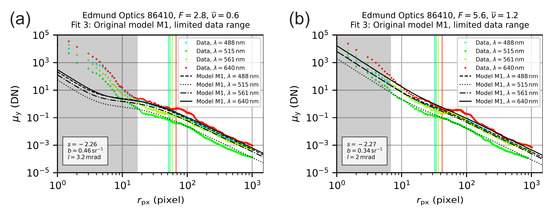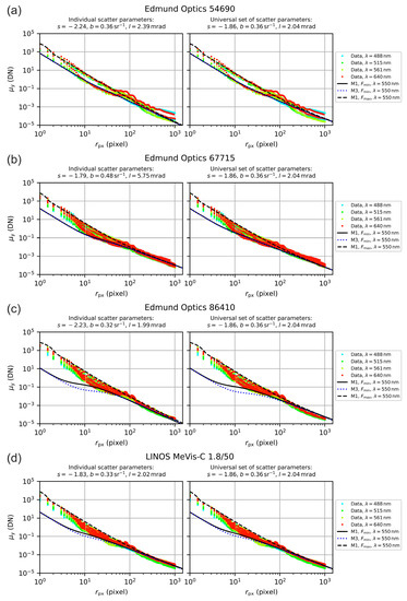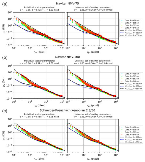 The aim of our investigations was to estimate for each camera lens the scatter parameters , and , in order to generate a generic set of scatter parameters. In the course of our experiments, we analyzed eight different lenses (seven camera lenses and one achromatic doublet, see Section 4) applying four different laser wavelengths at various integration times and laser powers, while the laser beam diameter was kept constant throughout. For each lens, the data set contained 1–7 measurement series, depending on the number of labeled settings of the lens’ aperture ring. The data ensemble of eight data sets contained in total 43 measurement series (see Table 6), i.e., 43 × 4 = 172 measurements or 43 × 4 × 8 = 1376 camera images, to be analyzed. Since the amount of data was quite huge, we used automated analysis software to derive the scatter parameters. Briefly, this included the following steps: