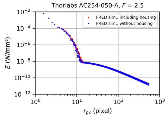 In order to measure the stray light irradiance at the focal plane of the camera lens, we used camera C (Allied Vision Mako G-419B NIR, Stadtroda, Germany) as a detector. The parameters of the camera are given in Table 2, which lists parameters as specified by the manufacturer [16] and parameters measured by ourselves. The latter were measured according to the EMVA 1288 standard; see Appendix B. From Figure 3 we can see that the central lobe of the diffraction pattern is within a radius of about 1–2 pixels of our camera. Therefore, we could not expect to resolve the central lobe with our camera-based experimental setup.