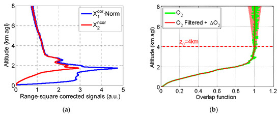 (a) Range-square corrected signals of System 1 and System 2; (b) Overlap function of System 2. The shaded red area represents . The measurement was performed on 18 June 2015 (150618).