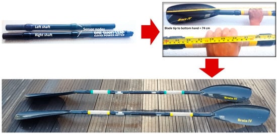 The Kayak Power Meter (One Giant Leap, Nelson, New Zealand), a commercially available product, was adopted in the present study to measure stroke force and power (Figure 1). This system was designed as an adjustable split-shaft system, with the right shaft being the master control allowing up to 5 cm of paddle length adjustment and preferred blade feather angles. The instrumented draft was made of carbon fibre, the same material as a regular shaft. While a regular shaft is hollow, the instrumented shaft is embedded with sensors (strain gauges and gyroscopes) and hence is heavier. The mass of the instrumented paddle shaft was 0.394 kg, which was 38% heavier than a regular shaft (approximately 0.285 kg). When assembled with paddle blades, the overall mass was 1.010 kg, approximately 12% heavier than a regular paddle of 0.901 kg. The validity of the Kayak Power Meter was reported to be within 0.12% to 1.4% of the true value, while the reliability ranged from 0.27% to 0.34% for an applied force of 155.9 N []. According to manufacturer specifications, the typical measurement resolutions were 1.0 N for the top hand and 2.5 N for the bottom hand, with a range of 780 N to 2100 N.