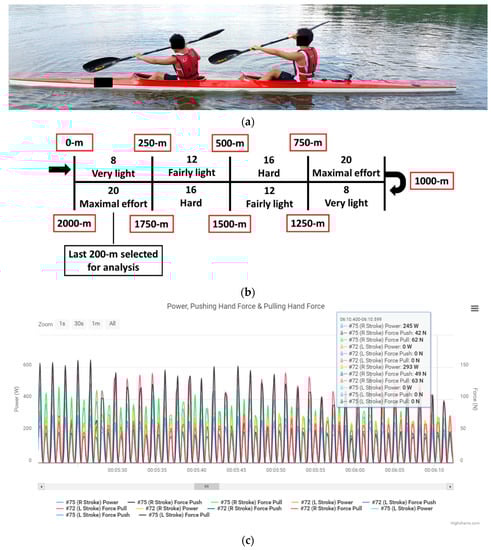Participants were asked to paddle two bouts of 2 km using self-paced intensities (Figure 2). The first bout was performed in K1, and the second in a K2 boat with their regular partner and in their preferred seat order (Figure 2a). This sequence replicated that a sprint kayaker would warm up in K1 before practicing crew boats. The experiment protocol was to change kayaking intensities every 250-m based on the 6-20 Borg scale []. The steps were 8 “very light”, 12 “fairly light”, 16 “hard”, and 20 “maximal effort”, and then the sequence was repeated (Figure 2b). Force and power data during the last 200-m of ‘maximal effort’ paddling were recorded using the analysis application (Figure 2c, http://analysis.onegiantleap.co.nz). Prior to each bout, participants were briefed again on the step protocol and encouraged to do their best. Between bouts, they had 20-min of passive recovery which included the time to adjust their seat and foot-rest fittings as needed. Participants used their own K1 and K2 boats that met the minimum competition weights of 12 kg and 18 kg, respectively. The total duration of the experiment for each crew was about 1 h.
