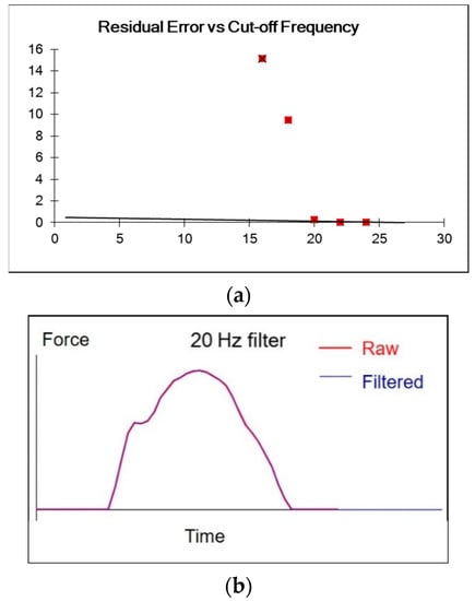 Stroke force and power data were transmitted and downloaded wirelessly in dat file format via the Windows Desktop App (Version 1.1.9.10). To extract the data, each file was uploaded sequentially onto a web-based application (http://analysis.onegiantleap.co.nz). In the literature, stroke force data have been processed with a 4th order low-pass Butterworth 20 Hz filter to smooth and remove random errors []. In the present study, visual inspection and residual analysis were performed to compare among cut-off frequencies of 16, 18, 20, 22, and 24 Hz (Figure 3). Subsequently, the value of 20 Hz was selected to filter all raw force and power data.