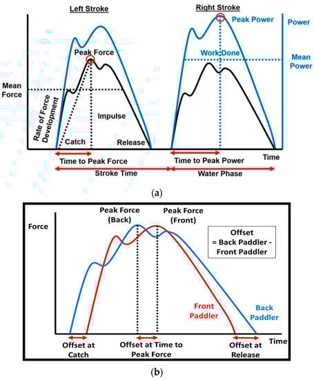 - Temporal variablesFor each individual kayaker, the temporal variables extracted were stroke rate, stroke time, water phase duration, time to peak force, and time to peak power (Figure 4a). Stroke time and water phase duration were defined according to the two-phase observational model by McDonnell et al. []. Stroke time was the duration from the catch of one stroke to the catch of the next stroke. Stroke rate was calculated by dividing 60 s by stroke time to obtain the number of strokes per min. To provide insights for the coordination strategies between the two crew members, timing offset variables were obtained at four instances of the stroke cycle: at the catch, time to peak force, time to peak power, and release (Figure 4b). An offset was defined as the timing difference of the back paddler with reference to the front paddler [,,]. A zero offset indicates that the two paddlers are in perfect synchronisation.