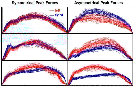 Among the 74 kayakers, different force profiles were observed (Figure 5). Within an individual, there existed various degrees of differences between the left and right sides, such as the magnitude of peak forces, timing of the peak force, and shape of the force–time curve.