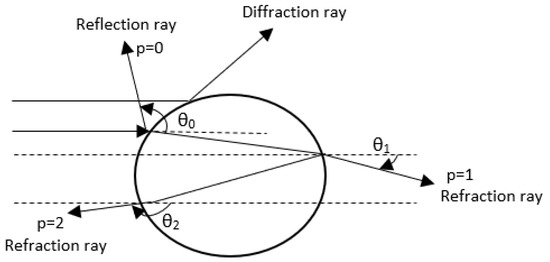 For particles that are much bigger than the wavelength of the incident light (at least 10 times bigger), are applicable the geometric optical laws. According to the geometrical optics, the amplitude of the scattered light is an overlapping of the reflected, refracted, and diffracted fractions. The assumption is that all incident rays coming from the ambient medium and crossing a particle are parallel. Each of these emerging rays is characterized by two parameters: the incident angle ( θ ) and number of chords that a ray makes inside the particle (p), as can be observed in Figure 1.