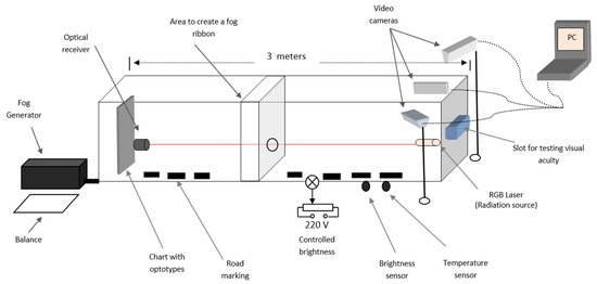 (c) Fulfill ophthalmologists’ requirements—the length of the chamber is three meters, to assure visual acuity evaluation requirements. During the experiments, in different fog conditions, the optotypes from the eye chart (44.3 mm biggest optotype and 4.43 mm smallest optotype from the chart) are monitored with a camera while using OCR (Optical Character Recognition) algorithms. On the other hand, in the same fog conditions, the visual acuity is evaluated by observers that need to read the optotypes by observing them on the “slot for testing visual acuity” (Figure 2—right side).