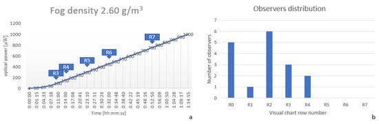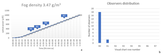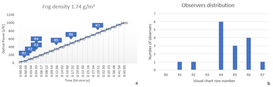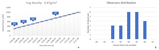 Figure 12. (a) Optical power and OCR measurements at a fog density of 3.47 g / m 3 (b) Observers visual acuity distribution at a fog density of 3.47 g / m 3 .