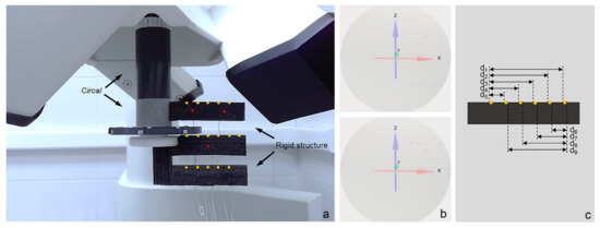 (a) Rigid structure attached to the circal and placement of sensors (active sensors, yellow; reference sensors, red); (b) position of the sensors (small arrows) inside the measurement area of the system (shaded area); (c) distances between sensors measured with a millimetre ruler (only one of the three levels of the structure showed).