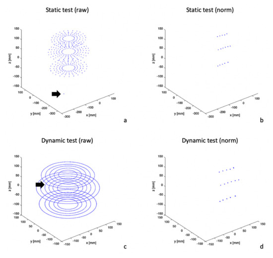 The raw data spatial representation (Figure 3a,c) showed alterations on the upper section of the measurement area. Arrows in (Figure 2a,c) show that at an angulation of 195° the data shift unexpectedly. This effect was more intense for static tests than for dynamic tests, where a depression was observed in the circular trajectory (Figure 3c).