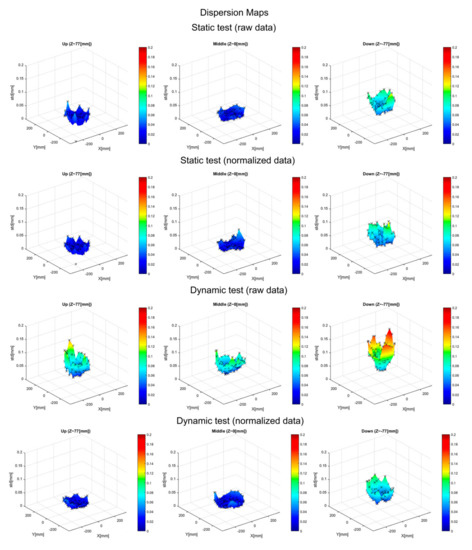 Position standard deviation (SD) maps for the repeated measurements registered in every test (rows from top to bottom: Raw data of the static test, normalized data of the dynamic test, raw data of the dynamic test, and normalized data of the dynamic test) for the three vertical levels considered (from left to right: Up, middle, and down). Black points indicate SD values calculated from registered data. The colored surface represents interpolated values included only to aid the interpretation of the graphs (the color bar indicates the SD level in millimeters).