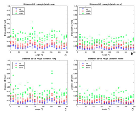 SD of the calculated Euclidian distance between sensors showed that the AG501 precision diminishes downwards in the measurement area (Figure 5). There are also angular directions easy to identify in which the precision is better than in others. In all cases, dispersion was greater for raw data than for normalized data. Distance-measurement SD values fluctuated between 0.002 mm and 0.151 mm (including all tests and conditions but excluding the outlier at 195°).