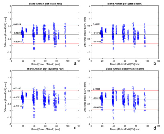 Bland-Altman plots to evaluate agreement between electromagnetic articulography (EMA) under different conditions and a millimetre ruler (black line: Mean value of the differences; red lines: Upper and lower limits of agreement). (a) Comparison between EMA raw data and the millimetre ruler measurements for the static test; (b) comparison between EMA normalized data and the millimetre ruler measurements for the static test; (c) comparison between EMA raw data and the millimetre ruler measurements for the dynamic test; (d) comparison between EMA normalized data and the millimetre ruler measurements for the dynamic test.