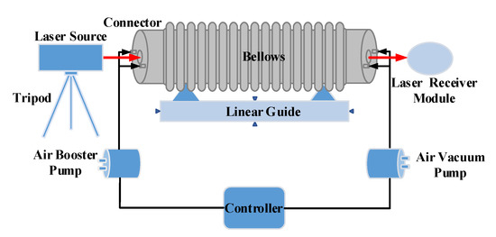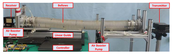 An experimental setup was constructed on a 4-DOF measurement system to verify the feasibility of the proposed method, as shown in Figure 9. The receiver and transmitter of the 4-DOF measurement system are located at both end of the bellows. The bellows is a type of scalable, high-temperature and wear-resistant circular pipe (MP06). The air booster pump (GEBS12120P802C) and air vacuum pump (GEBS1272805C) are both micro pumps. The flow and airflow speed can be controlled through the motor voltage of pumps. The controller is a development board based on ARM. The laser beam drift is measured by the laser receiver module, which is placed at a fixed position of 2 m away from the laser source.