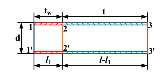 The computational model of fluid flow is shown in Figure 4. The length l of the bellows is 2 m. Air flows into the bellows from the cross section 1–1′ and flows out from the cross section 3–3′. Supposing that a local heat source with a length of l1 is applied to the bellow wall, the local temperature of the wall increases to tw. According to the balance equation for flow and heat transfer [24], the average airflow speed um in the bellows can be calculated as follows: