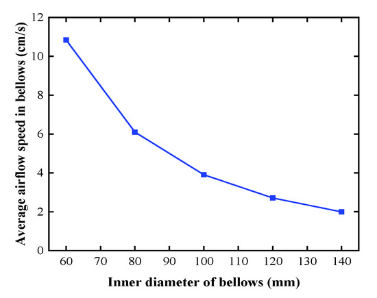 Average airflow speed in the bellows for different inner diameters.