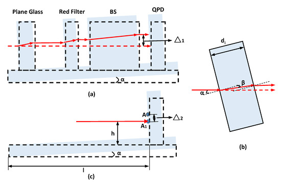 Angle error and straightness error can be measured simultaneously for the proposed a 4-DOF measurement system. However, additional straightness error will occur due to the angle error of guide rail, which will reduce the measurement accuracy of straightness error. Hence, the coupling between the two errors needs to be reduced or eliminated by choosing appropriate parameters and positions of optical elements. As the QPD, BS, red filter, and flat glass are vertically mounted on the guide plate, an angle will occur between the laser beam and these optical elements in the case of a pitch or yaw of the guide plate (Figure 6a). When the inclination angle of the plate is α, the laser offset caused by refraction when the laser beam passes through an optical element is Δ1 (Figure 6b). The expression of straightness error caused by angle error is as follows:
