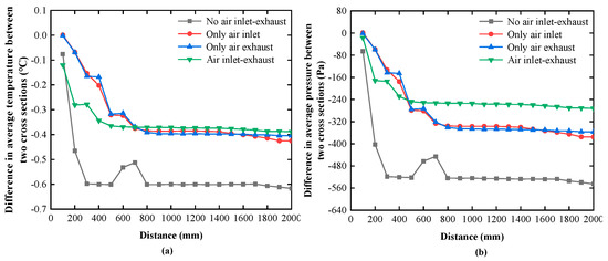 The average temperature difference between the two cross sections, as shown in Figure 8a, can be directly analyzed through the simulation tool. However, the average pressure difference between the two cross sections must be calculated using Equation (23), as shown in Figure 8b. The circumstance with the air inlet and exhaust stands out from the three other modes because either the average temperature or the average pressure difference between the two cross sections is small. The simulation results are tabulated in Table 1. In the desired mode, the maximum axial temperature and pressure gradients are 0.15 °C/m and 136 Pa/m, respectively, both of which meet the design requirements. Hence, the mode with air inlet and exhaust is utilized in this study, and the air inlet speed is set to be equal to the exhaust speed in experiments.