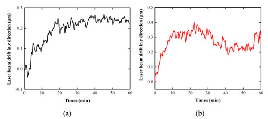 Experimental results of the laser beam drift in (a) x and (b) y directions under normal ambient condition without external temperature interference.